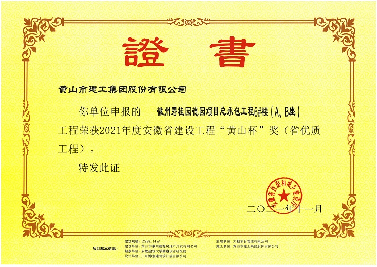 由黃山建工集團承建的徽州區(qū)碧桂園德園項目總承包工程6#樓(A、B座) 工程榮獲安徽省工程質(zhì)量最高獎“黃山杯”獎。該工程在開工伊始,項目部就制訂了創(chuàng)優(yōu)目標(biāo),嚴(yán)格過程控制,建立健全項目質(zhì)量管理體系,狠抓現(xiàn)場施工管理,把好施工過程質(zhì)量控制關(guān),為創(chuàng)精品工程打下堅實的基礎(chǔ)。