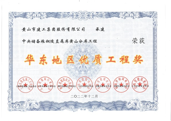 由黃山建工集團(tuán)股份有限公司承建的“中央儲(chǔ)備糧銅陵直屬庫(kù)黃山分庫(kù)工程”榮獲華東地區(qū)各省建筑業(yè)協(xié)會(huì)聯(lián)合頒發(fā)的“華東地區(qū)優(yōu)質(zhì)工程獎(jiǎng)”。