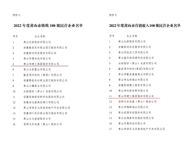 日前,由黃山市工商聯(lián)、市經(jīng)信局、市監(jiān)管局及市商務(wù)局聯(lián)合發(fā)布2022年度黃山市民營企業(yè)納稅及營銷收入百強(qiáng)名單公布,黃山建工集團(tuán)連續(xù)多年再次實力入圍,獲此殊榮!