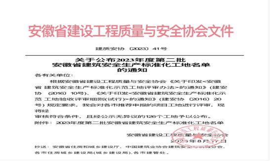 8月17日,安徽省建設(shè)工程質(zhì)量與安全協(xié)會(huì)發(fā)布2023年度第二批安徽省建筑安全生產(chǎn)標(biāo)準(zhǔn)化工地名單,黃山建工集團(tuán)仙人洞南路東側(cè)D1地塊(文瀾軒)項(xiàng)目獲評(píng)“安徽省建筑安全生產(chǎn)標(biāo)準(zhǔn)化工地”。