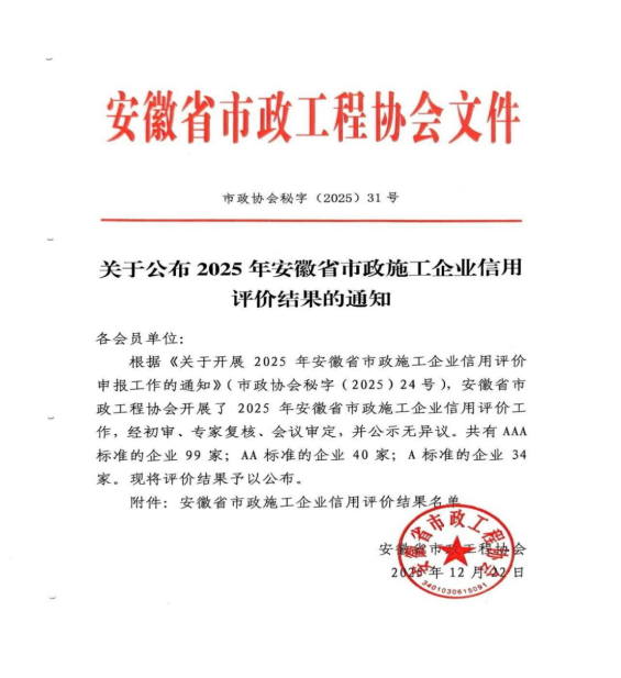 近日,安徽省市政工程協(xié)會正式發(fā)布《關(guān)于公布2025年安徽省市政施工企業(yè)信用評價結(jié)果的通知》。黃山市建工集團憑借卓越的綜合實力、規(guī)范的市場行為、優(yōu)良的工程品質(zhì)及堅實的信用體系建設(shè),成功獲評最高信用等級——AAA級。標(biāo)志著集團在誠信經(jīng)營、履約能力與社會責(zé)任履行方面獲得了行業(yè)主管部門與協(xié)會的高度認可,是企業(yè)信用建設(shè)領(lǐng)域的又一重要里程碑。