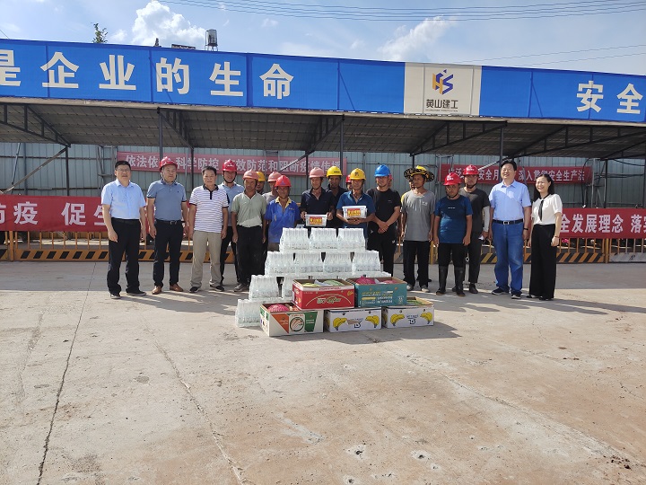 7月21上午,業(yè)主單位黃山市城投集團(tuán)黨委書(shū)記、董事長(zhǎng)陳杰、總裁黃世穩(wěn)等一行分組帶隊(duì)到我公司承建的黃山市危險(xiǎn)(含醫(yī)療)廢物集中處置中心易地重建工程、黃山市南部城鎮(zhèn)群水務(wù)調(diào)度中心項(xiàng)目、黃山生豬定點(diǎn)屠宰加工及配套設(shè)施項(xiàng)目及配套冷鏈項(xiàng)目施工現(xiàn)場(chǎng)送來(lái)了人丹、十滴水、礦泉水、西瓜等防暑降溫用品,并向奮戰(zhàn)在一線的施工人員及項(xiàng)目部管理人員表示了親切的慰問(wèn)和感謝,對(duì)一線人員頭頂烈日不畏酷暑的精神給予了贊揚(yáng)。