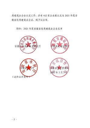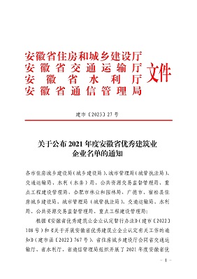 根據(jù)《安徽省優(yōu)秀建筑業(yè)企業(yè)認(rèn)定暫行辦法》和《關(guān)于開(kāi)展安徽省優(yōu)秀建筑業(yè)企業(yè)認(rèn)定有關(guān)工作的通知》。省住房城鄉(xiāng)建設(shè)廳會(huì)同省交通運(yùn)輸廳、省水利廳、省通信管理局組織開(kāi)展了2021年度安徽省優(yōu)秀建筑企業(yè)認(rèn)定工作。